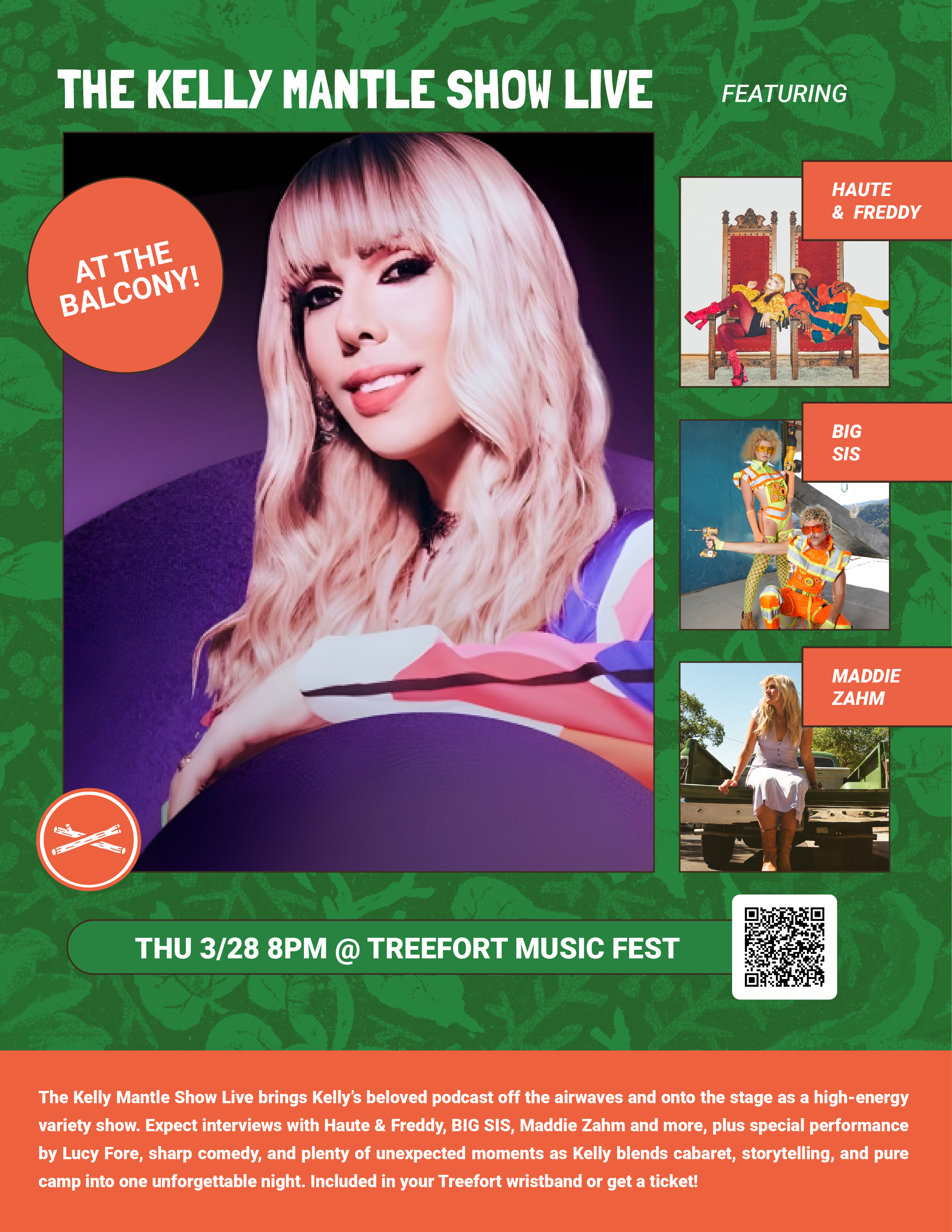 The Kelly Mantle Show Live brings Kelly’s beloved podcast off the airwaves and onto the stage as a high-energy variety show. Expect interview with Haute & Freedy, BIG SIS, Maddie Zahm and more, plus a special performance by Lucy Fore, sharp comedy, and plenty of unexpected moments as Kelly blends cabaret, storytelling, and pure camp into one unforgettable night. It’s part talk show, part live spectacle, and entirely unpredictable. Included with your Treefort wristband!