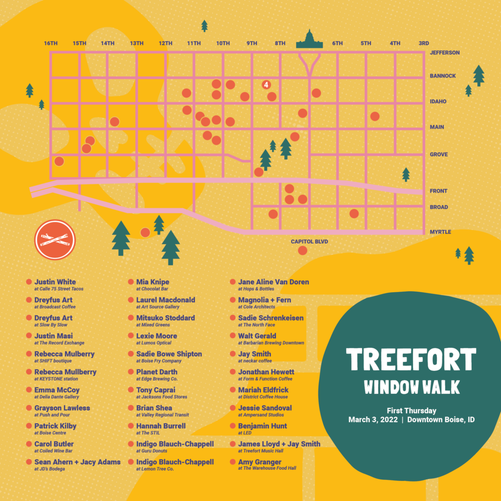 The countdown to Treefort 10 is officially on! Celebrate the First Thursday of March (aka Treefort month) with a Treefort art walk around downtown Boise. We partnered with nearly 30 talented artists to create one-of-a-kind Treefort-inspired artwork decorating the windows of our beloved downtown Boise businesses.